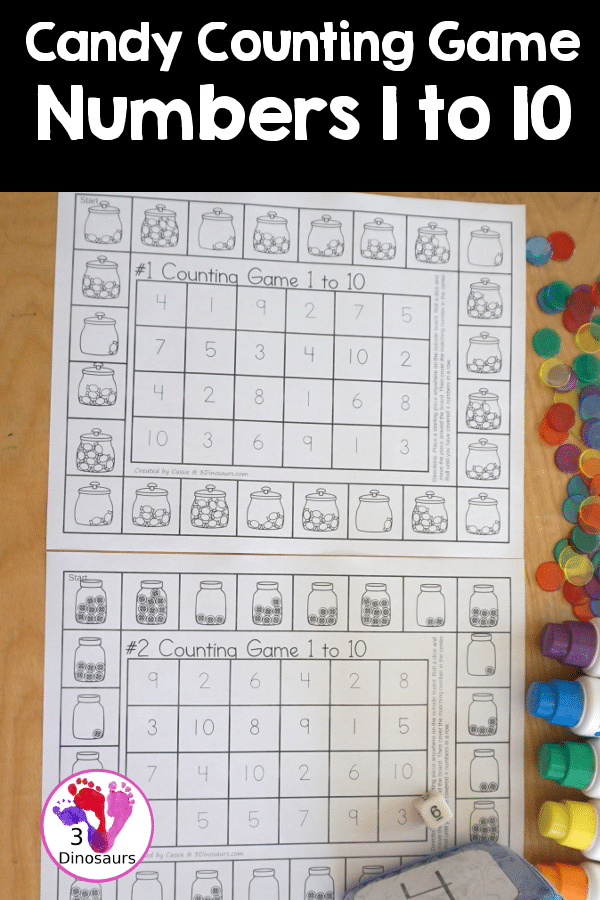 This game can be determined by you for your students. You can take these candy counting pages and have students move around the outside of the pages with a die and color in the number represented by the jar they land on.