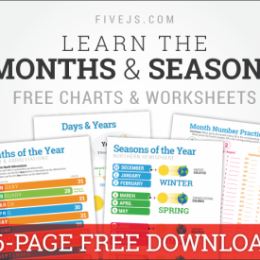 Work on calendar skills with this free months and season worksheet set at Five J’s. This free 16 page set includes: Month names & abbreviations Month length Leap Year Seasons (both Northern & Southern Hemisphere) and more! Thanks, Money Saving Mom! Click here for more free homeschool printables!