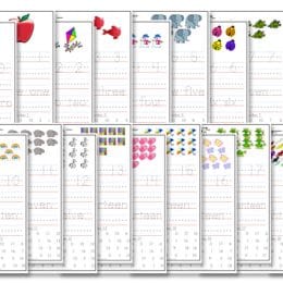 Here is a FREE Pack of Kindergarten Number Printables. Each one includes number writing practice, then writing the number on your own, practicing the number word, writing the word on your own, and finally a number hunt for that number. Click here for more free math resources for homeschoolers!