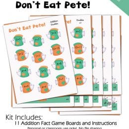 Here is a FREE Don’t Eat Pete Addition Printables. This set includes 11 addition facts, instructions and game board. Click here for more free math resources for homeschoolers!