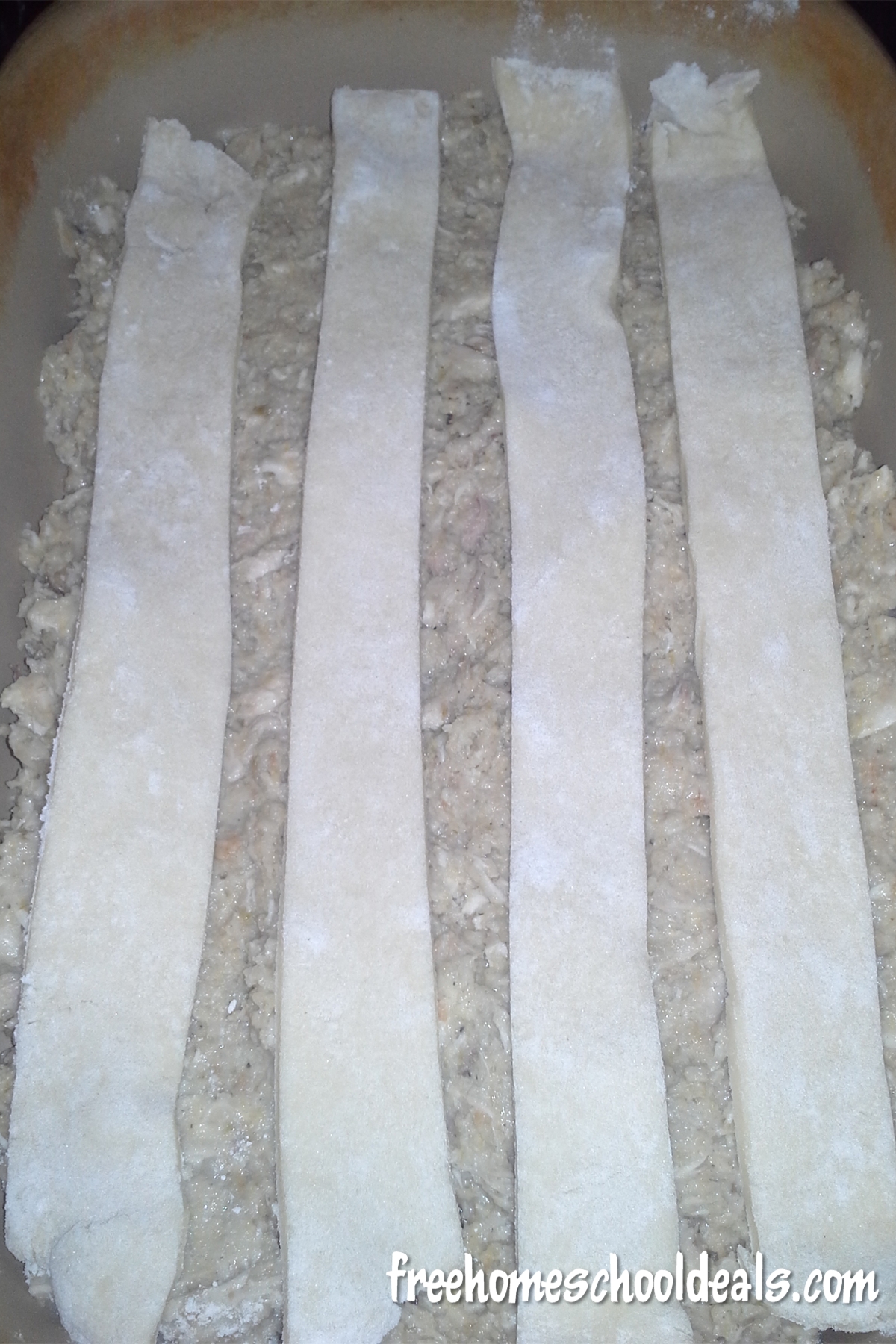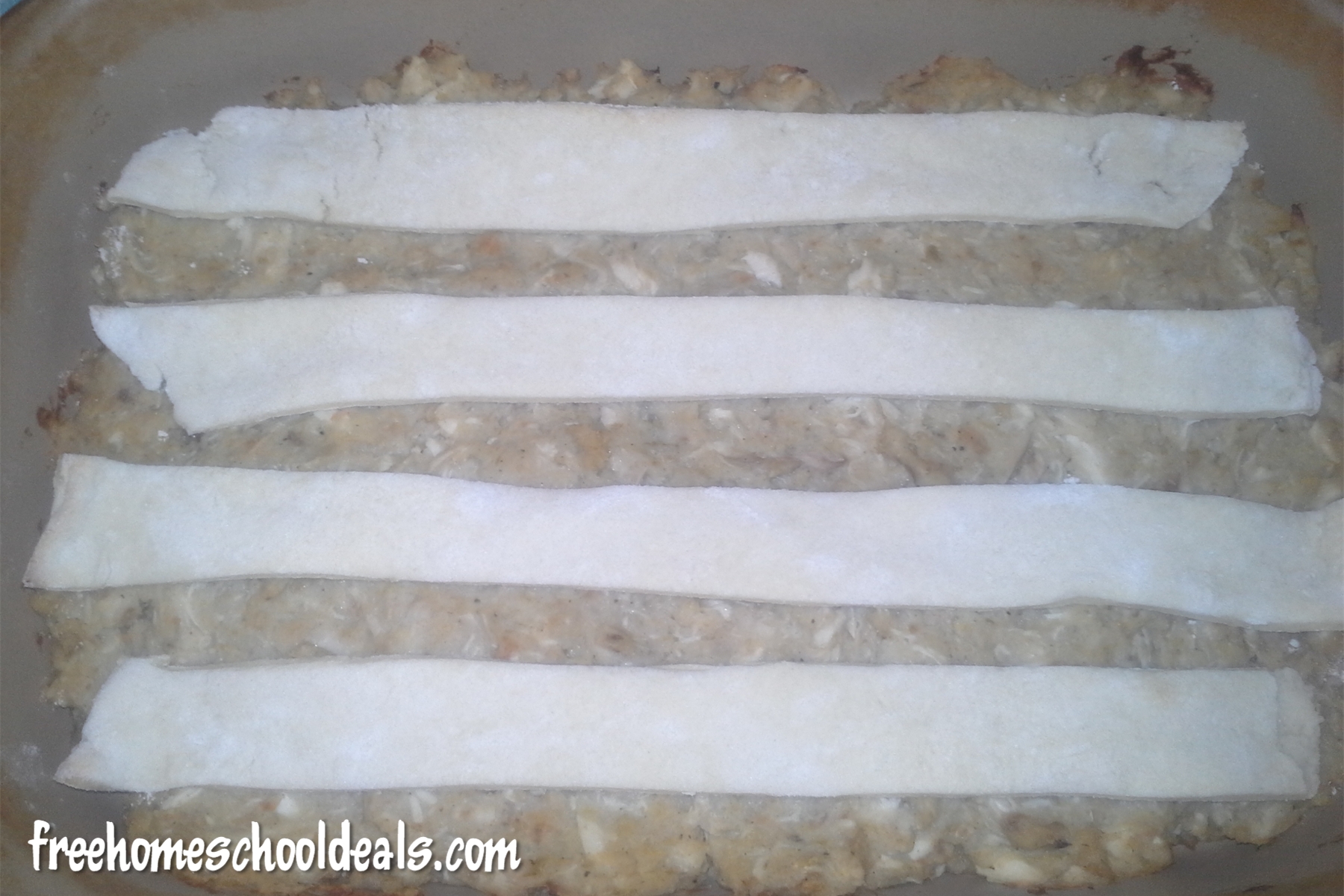 - stone). Lay strips of crescent roll dough across the top, leaving space