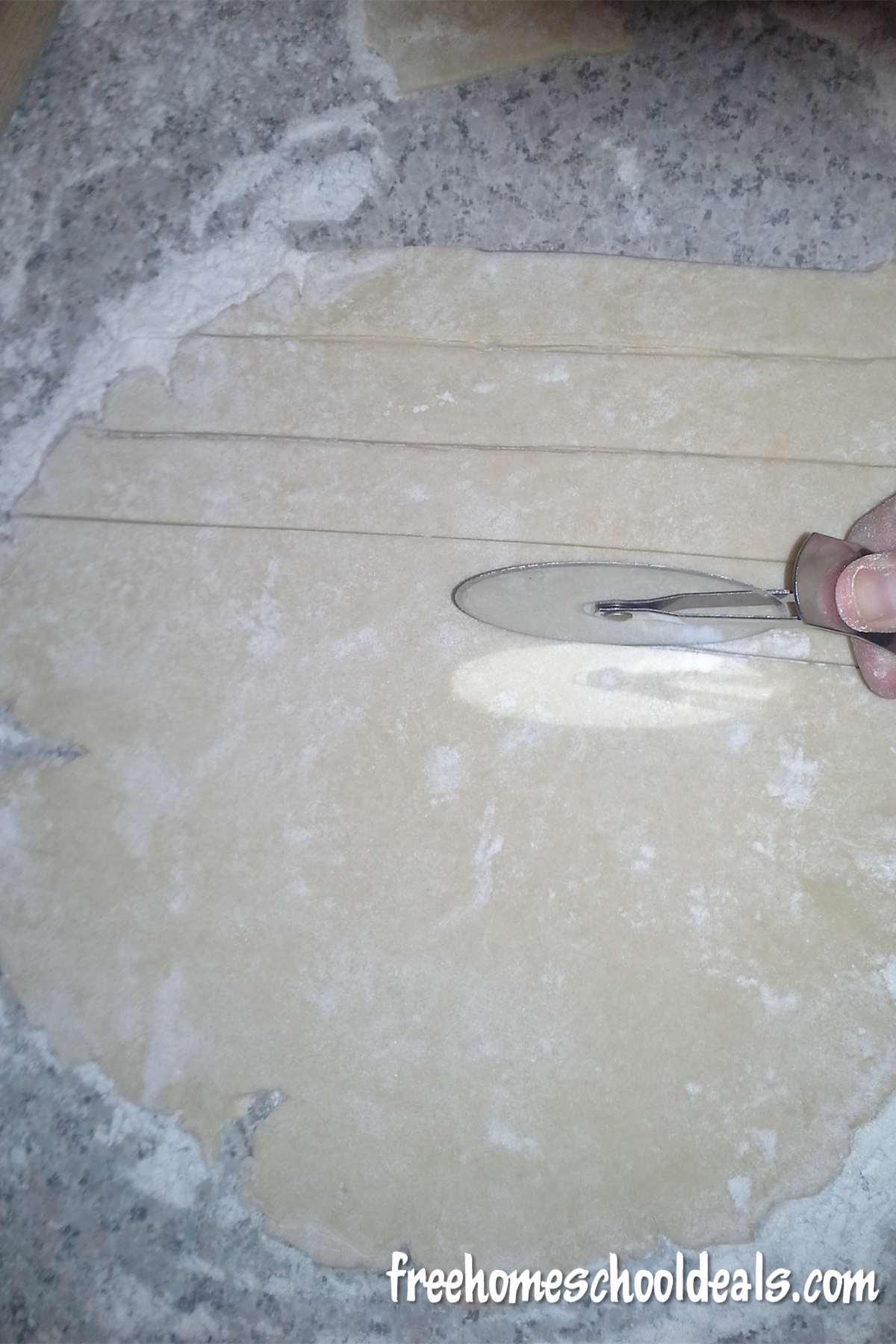 - Cut dough into 1” strips using a pastry knife. Of course, a nice pizza cutter works