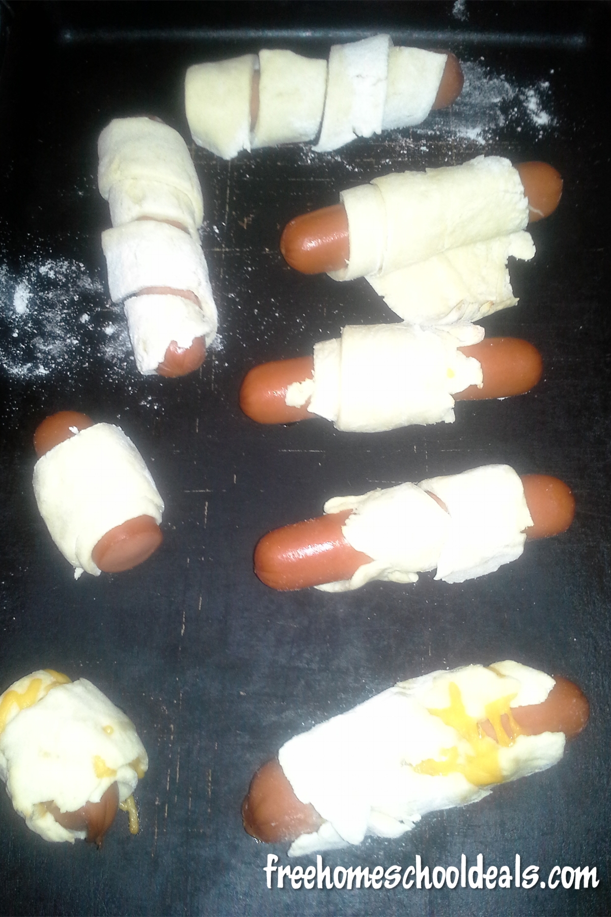 Place Cheesy Hot Dog Roll-Ups on a greased cookie sheet (or a well used Pampered Chef pan).