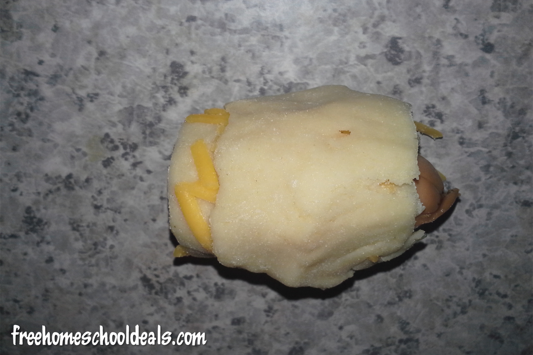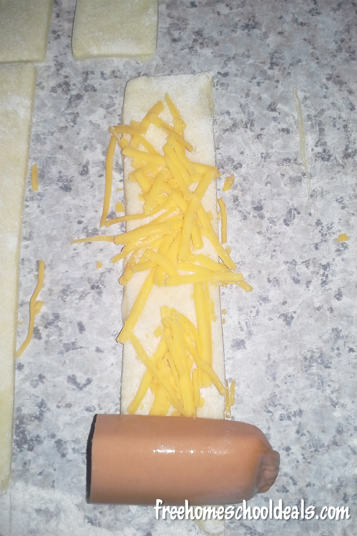 Put some shredded cheese on the crescent roll strip and place your hotdog at one end.