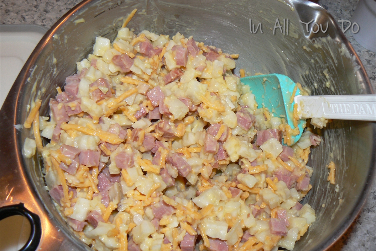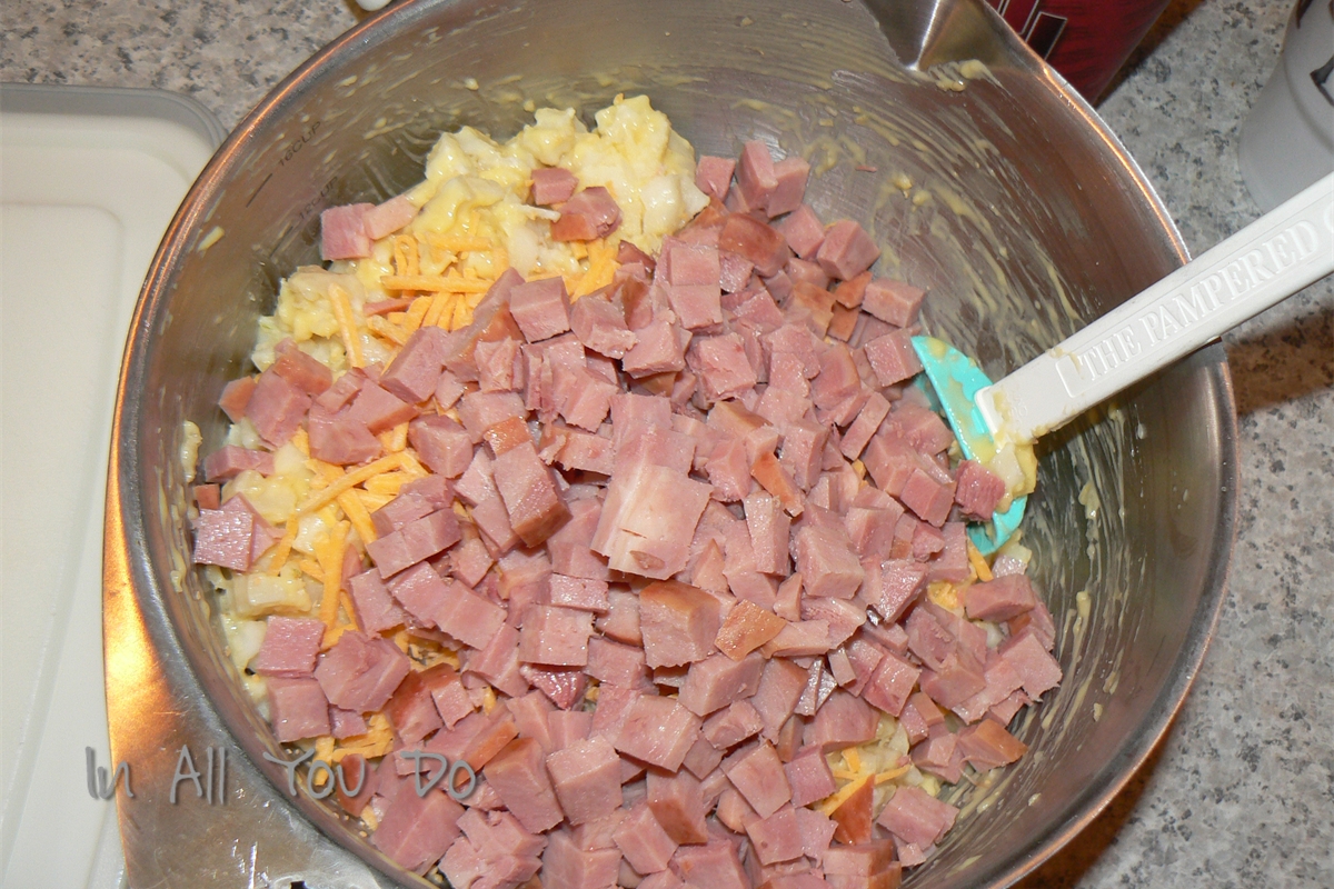 - In a medium bowl, combine the potatoes, ham, onion & 1 cup cheese, soup & butter.