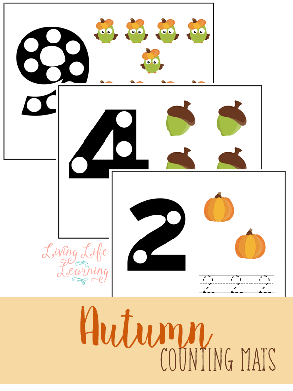 Practice counting with these cute FREE Autumn counting mats from Living Life and Learning. You can place counters on top of the pictures or the dots on the numbers. You could also use dot markers or bingo dabbers to color the numbers as well.