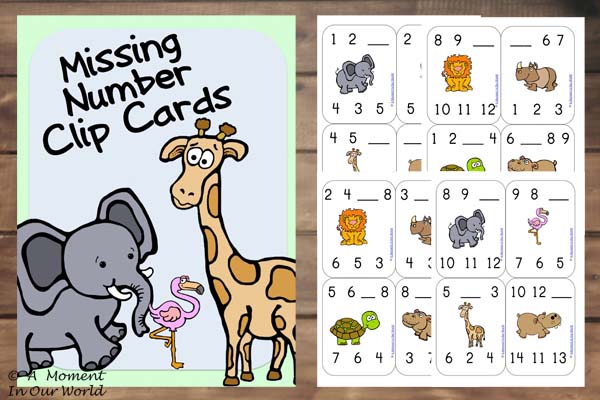 A great way to learn about numbers is with these awesome {FREE} Printable Missing Number Clip Cards from A Moment In Our World. There are 28 clip cards which you can use by adding a peg or by placing a pom pom on the correct answer.