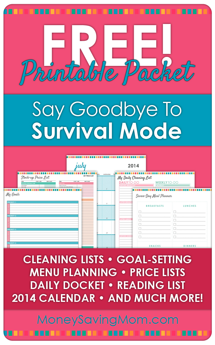 My friend Crystal from MoneySavingMom.com is offering a HUGE free 40-page printable packet. These free printables are to celebrate the upcoming release on her new book, Say Goodbye to Survival Mode (which I’m currently reading and devouring!).