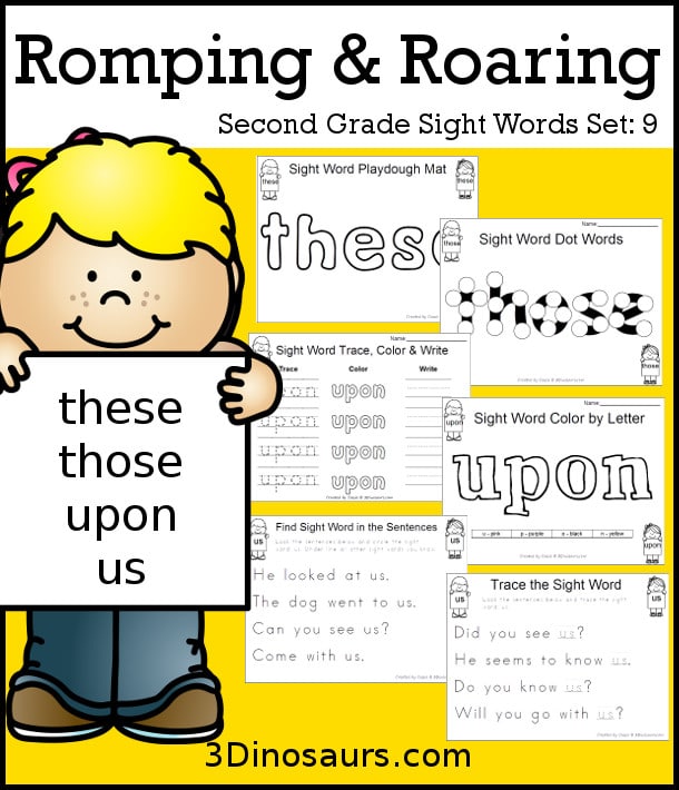 In this set, the focus is on sight words “these, those, upon, us”. The pack includes tracing pages, find the sight word, playdough mats, and more! There are 6 pages of different activities for each sight word.