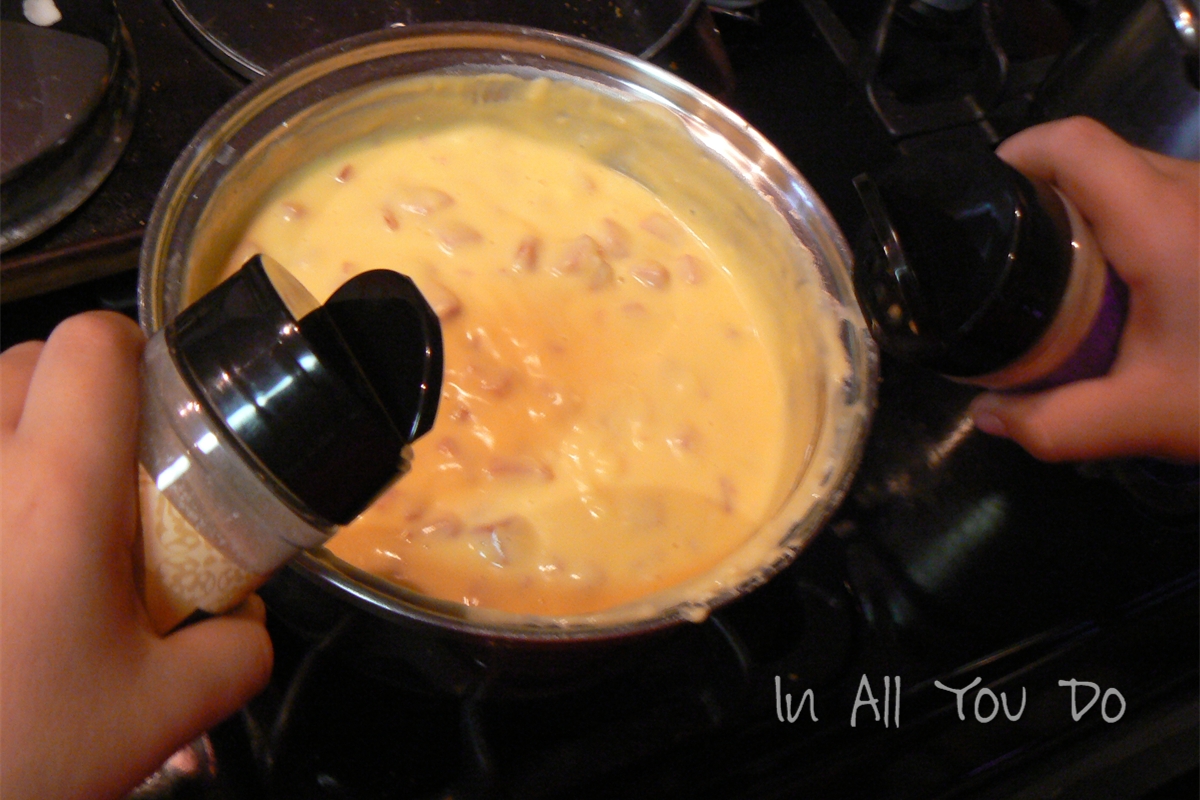 - When it’s almost to a boil (you know those few bubbles start popping up), add the cheese. Reduce heat to med-low and stir until cheese is all melted and it’s creamy.