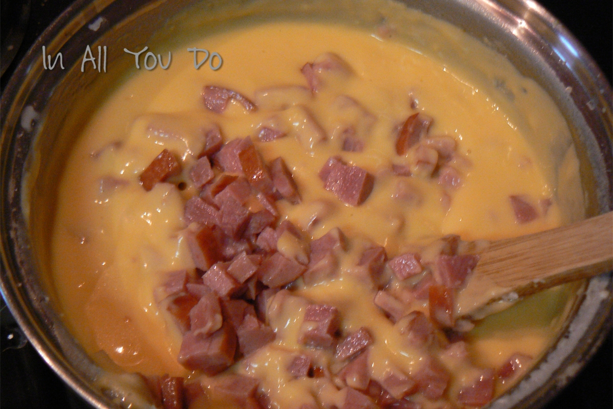 - Add the diced ham and stir to incorporate it completely. You will want to continue stirring until the meat is warmed up. (Approx. 5 min or less) Sometimes we even turn the heat off all together because the sauce is hot enough to warm the meat.