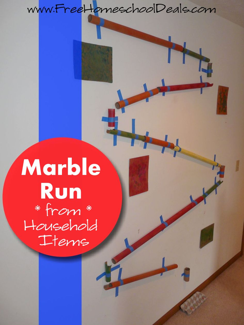 Want to take it a step further? Try timing how long each marble takes to run the race. Ask your kids how long it would take to send three marbles through, one at a time. How many marbles could go through in the course of three minutes? Every marble won’t stay on track perfectly. Determine the percentage of successful runs from a batch of 10 marbles.