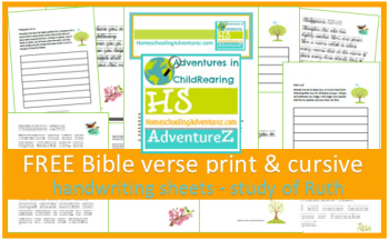 Find free notebooking pages and Bible verse handwriting worksheets for a Study of Ruth at Homeschooling AdventureZ. The Bible verses come from the New King James version.