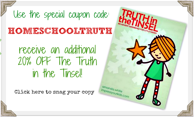 Truth in the Tinsel is a wildly popular advent experience for little hands. My readers can use the special coupon code: HOMESCHOOLTRUTH to buy a copy for 20% off!